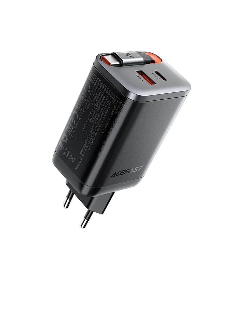 СЗУ USB/Type-C Acefast A111 (67W, QC3.0, PD, 2 порта, GaN, выдвижной кабель Type-C) Черный